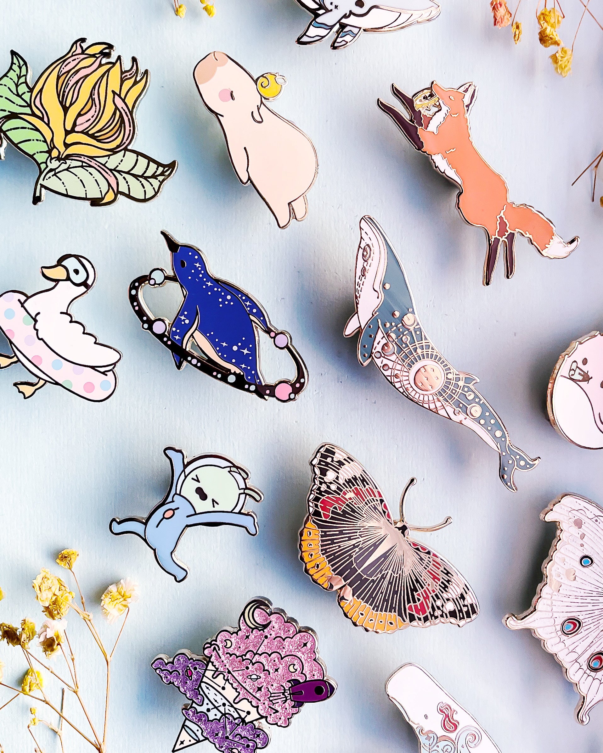 Enamel pin collections featuring cute and fun themes including animals, birthstones, space, nature and more.