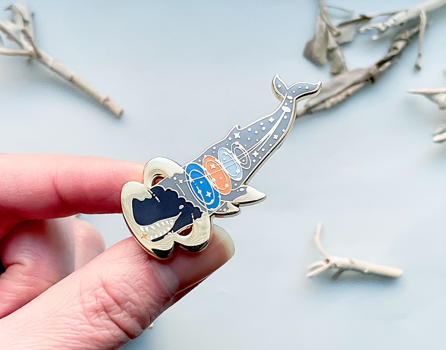 This Livyatan Ancient Whale enamel pin features the now extinct sperm whale that once roamed the oceans as an apex predator and inspired countless stories and mythologies about sea monsters. Livyatan, also sometimes referred to as Leviathan, is a genus of extinct sperm whales with large teeth that they used to hunt. This pin features the Livyatan going through a worm hole, devouring stars along its way. This is a blue and gray pin with orange accents. This hard enamel pin is set on a highly-polished gold-plated metal and has two posts on the back.