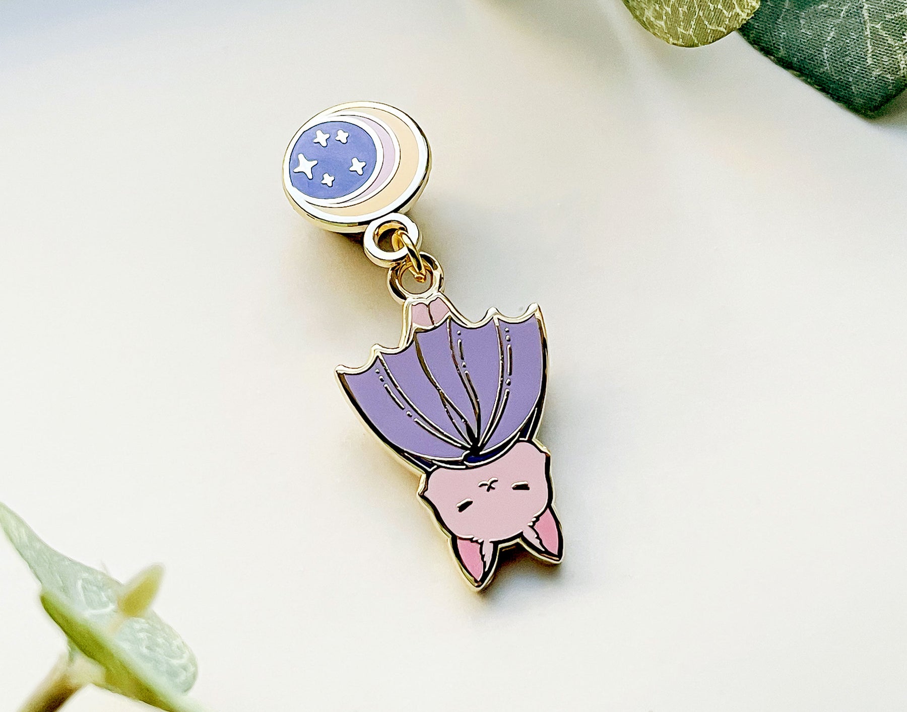 This adorable moon hanging baby bat enamel pin features my original illustration of an adorable bat hanging upside down on a crescent moon. This hard enamel pin features two pieces and is 2.1" from tip to tip. The top piece is single-sided and the bottom piece is double-sided so your cute bat will look good on both sides. This pin features a lovely color palette of pink, purple, blue and yellow. This hard enamel pin is set on a highly-polished gold-plated metal and has one post on the back of the moon piece.