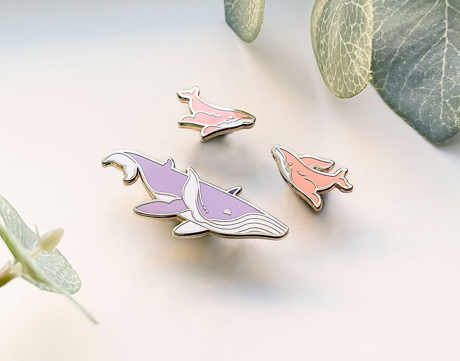- Large whale pin is 1.25", small whale pins are 0.75" to 0.8" in size.