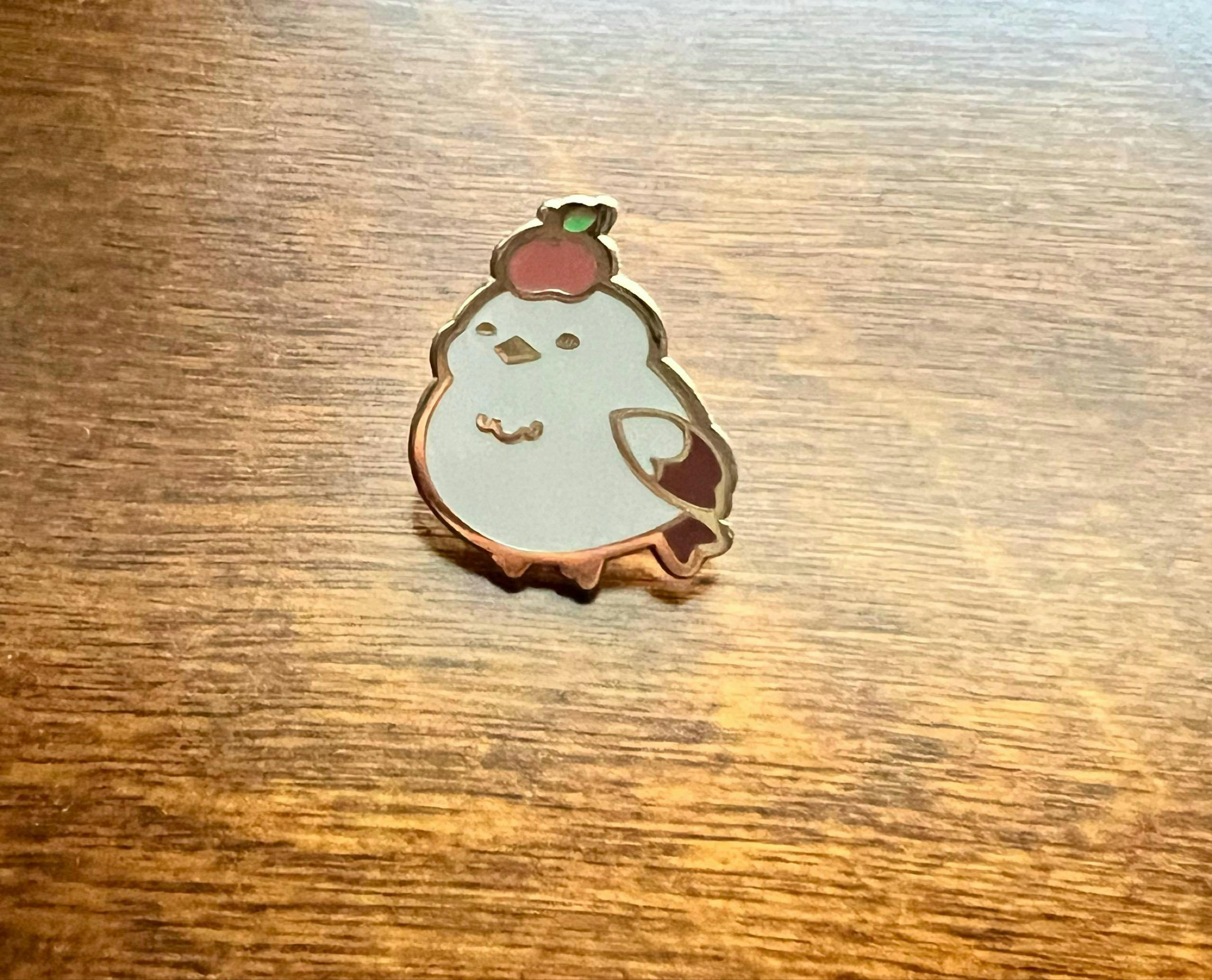 This cute Kiki the Shima Enaga Bird With Persimmon enamel pin features my original character and illustration of Kiki the Snow Fairy or Shima Enaga bird. These birds are small and fluffy and are found in Hokkaido, Japan. Kiki is adorable and has a persimmon balanced on her head. This small pin features a white, orange-pink and warm brown color palette and is 0.75" in size and set in gold-plated metal. This pin has a single post on the back.