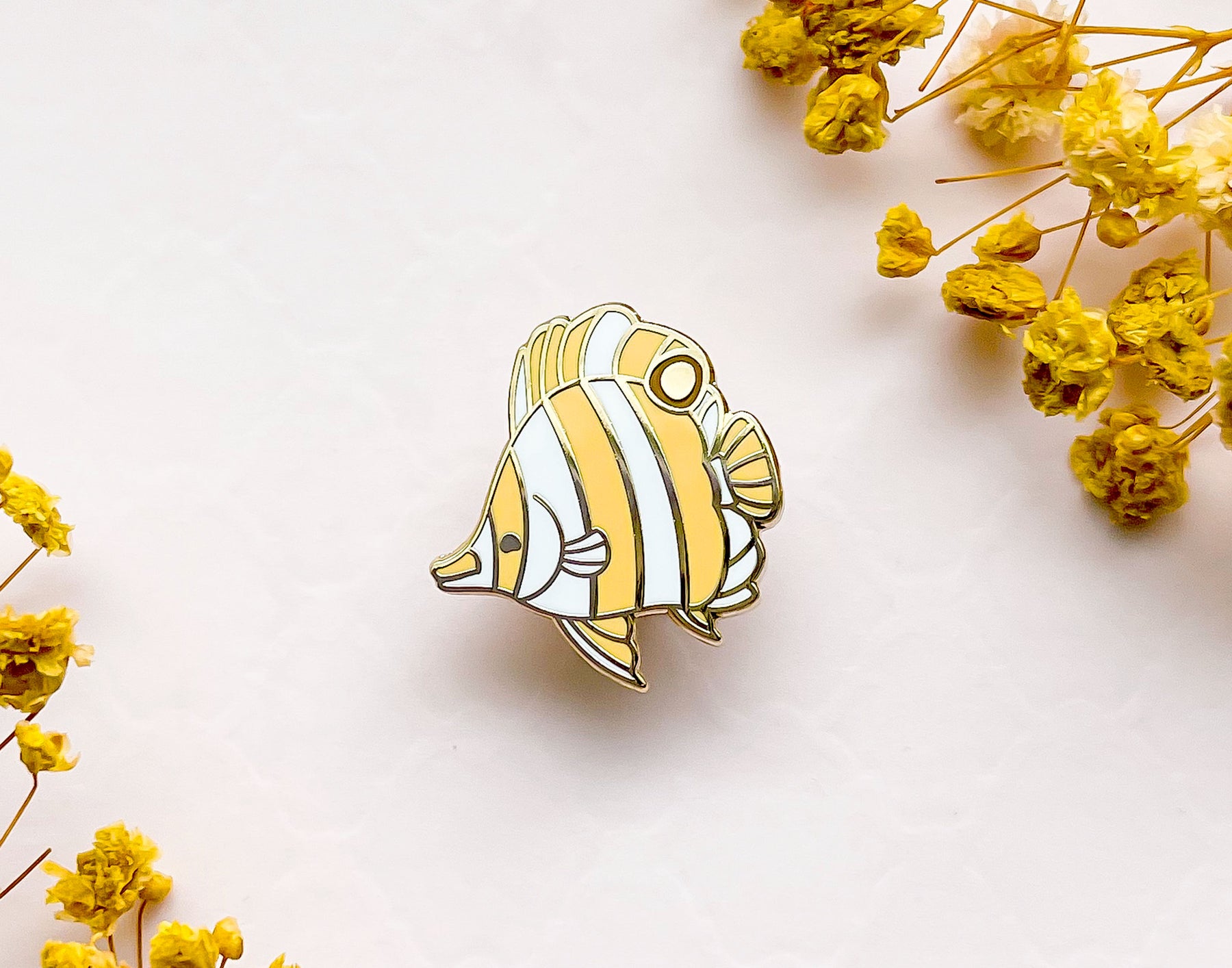 - The tiny copperband butterflyfish pin illustration is based on my original artwork.