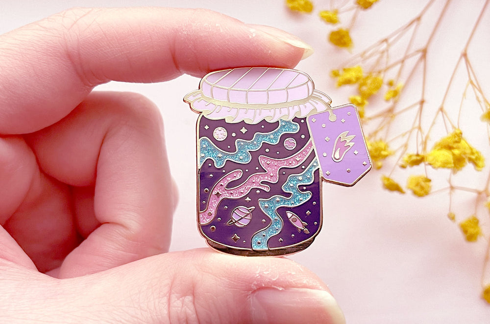 This pretty Cosmic Jam enamel needle minder features a jar filled with space and wonder. This needle minder is an excellent way to keep your needles safe and sound and in one place by hanging out on your current project. This hard enamel needle minder is 1.5", gold plated, and features a palette of pink, blue and purple with glitter. Needle Minders can be shipped with or without a magnet included. To use, place the design side of the needle minder face up on your project, then place the magnet on the back of your project. Your needles will stick to the pretty side of your needle minder and stay safe.