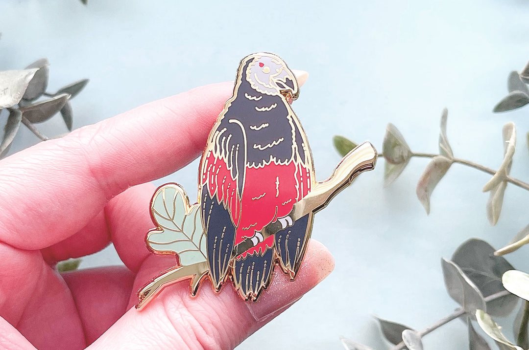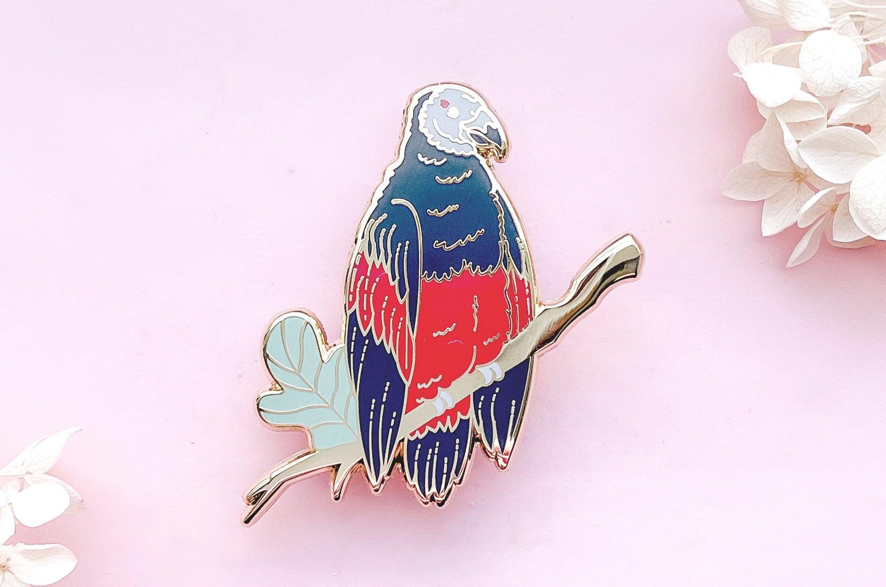 This beautiful Dracula Parrot Enamel Pin features the bird native to New Guinea and is also known as the vulturine parrot which prefers to feed on figs. This hard enamel pin is 2" from tip to tip and was my Patreon Award for June 2023. This hard enamel pin is set on a highly-polished gold-plated metal and has two posts on the back.