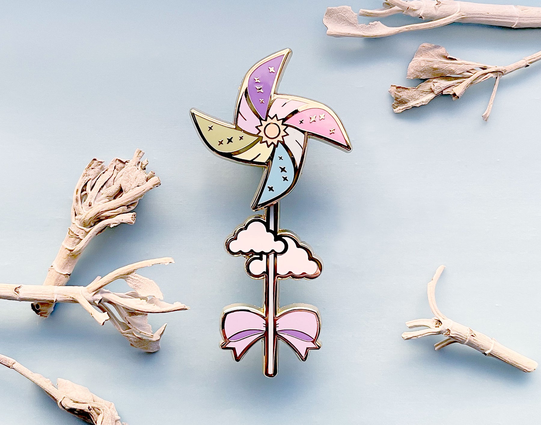 This beautiful Sunny Day Pinwheel Spinning Enamel Pin features a lovely pinwheel or wind spinner with colorful pieces and a sky motif. Real pinwheels of this style are usually made with paper or a thin plastic material. They are meant to catch the wind and spin using their specially shaped 'fins'. This enamel pinwheel also spins, but you may need to give it a little boost! This pin is hard enamel and it features a cheerful assortment of blue, pink, purple, green, yellow and white colors. This pin measures 2.5" in length, has two metal plates where the wheel portion can be spun, and it has two posts on the back.