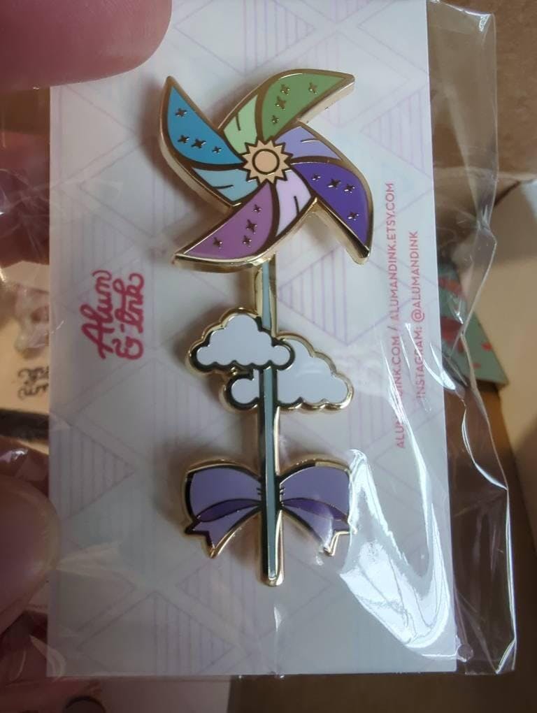 This beautiful Sunny Day Pinwheel Spinning Enamel Pin features a lovely pinwheel or wind spinner with colorful pieces and a sky motif. Real pinwheels of this style are usually made with paper or a thin plastic material. They are meant to catch the wind and spin using their specially shaped 'fins'. This enamel pinwheel also spins, but you may need to give it a little boost! This pin is hard enamel and it features a cheerful assortment of blue, pink, purple, green, yellow and white colors. This pin measures 2.5" in length, has two metal plates where the wheel portion can be spun, and it has two posts on the back.