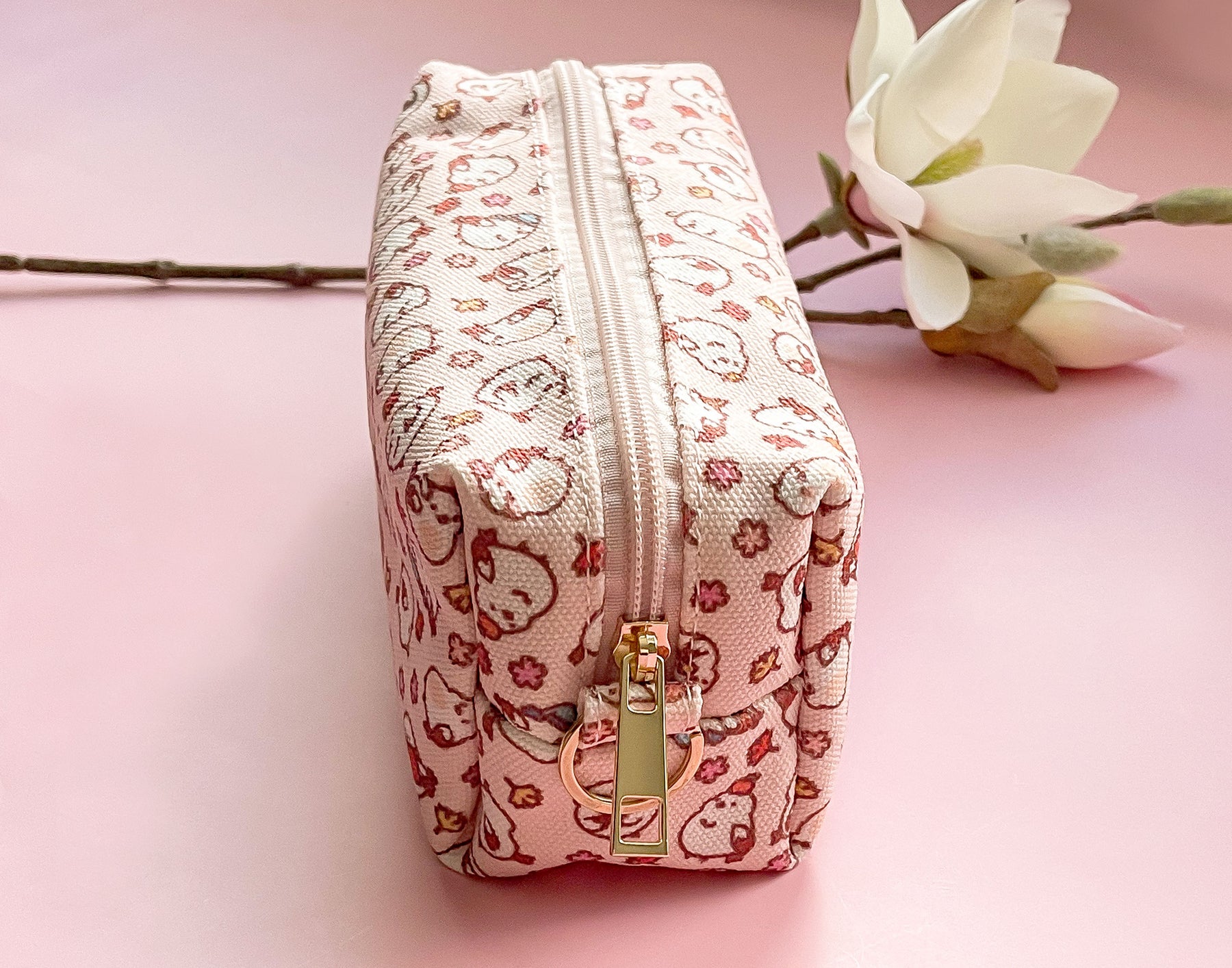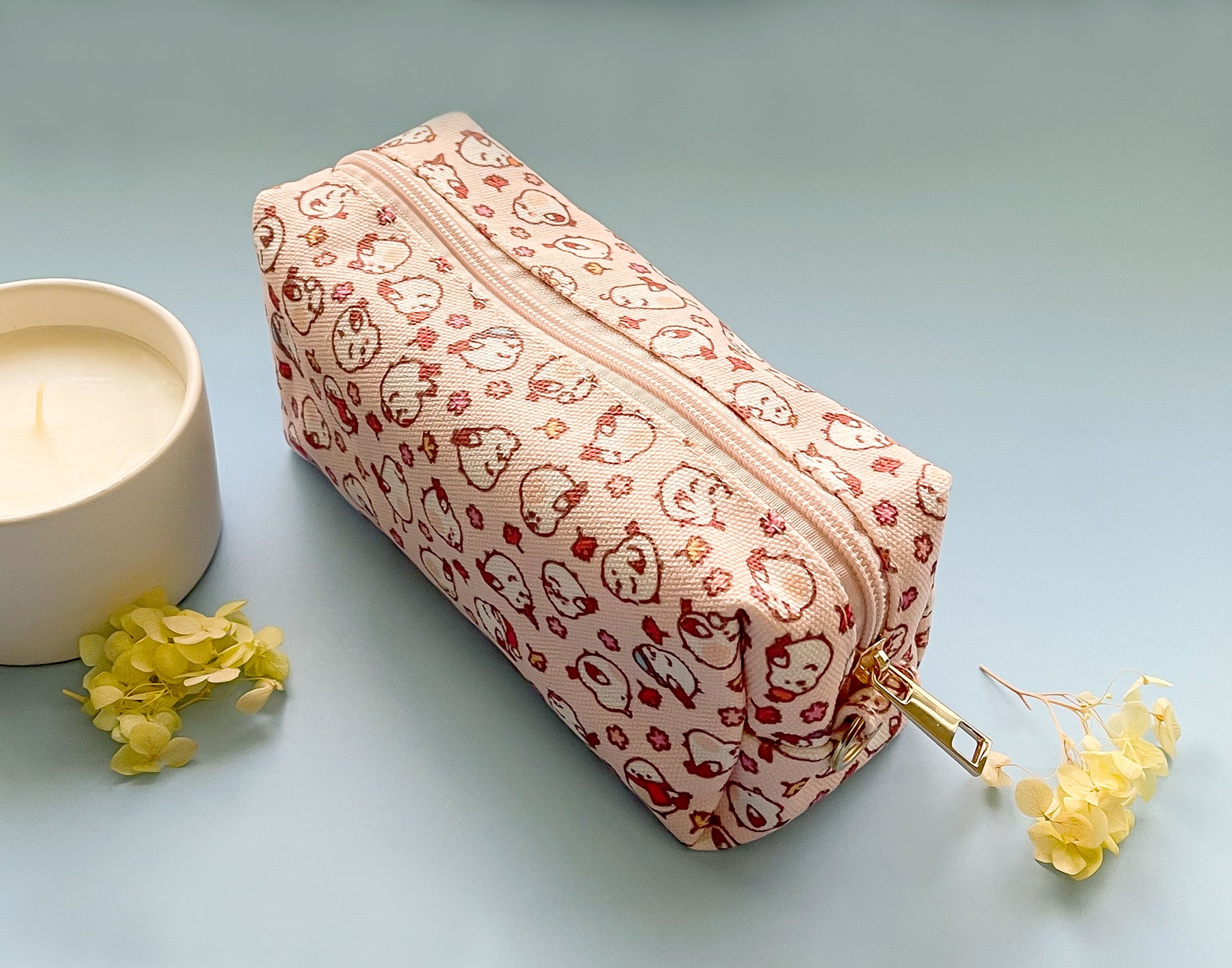 This beautiful shima enaga kawaii birds patterned pouch features my original pattern of adorable shima enaga birds on a creamy pink background with leafy accents. This pouch features a 100% cotton canvas outer shell with a purple polyester lining that's easy to clean. This pouch can be used for your pencils, makeup, travel necessities, crafting supplies and more. Comes with a keyring that can have charms attached to it. The pouch measures 7.5"x3"x3" (L/W/H).