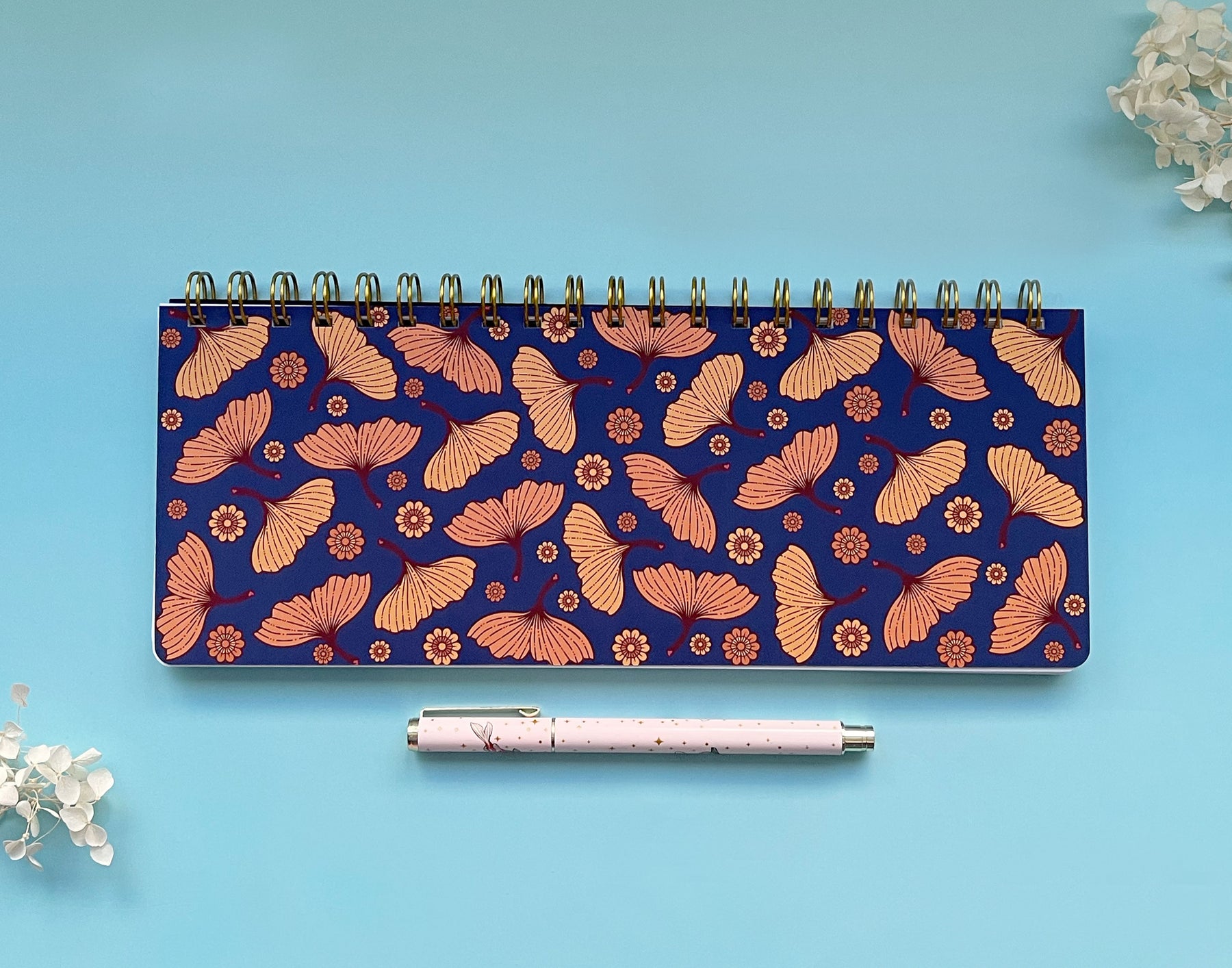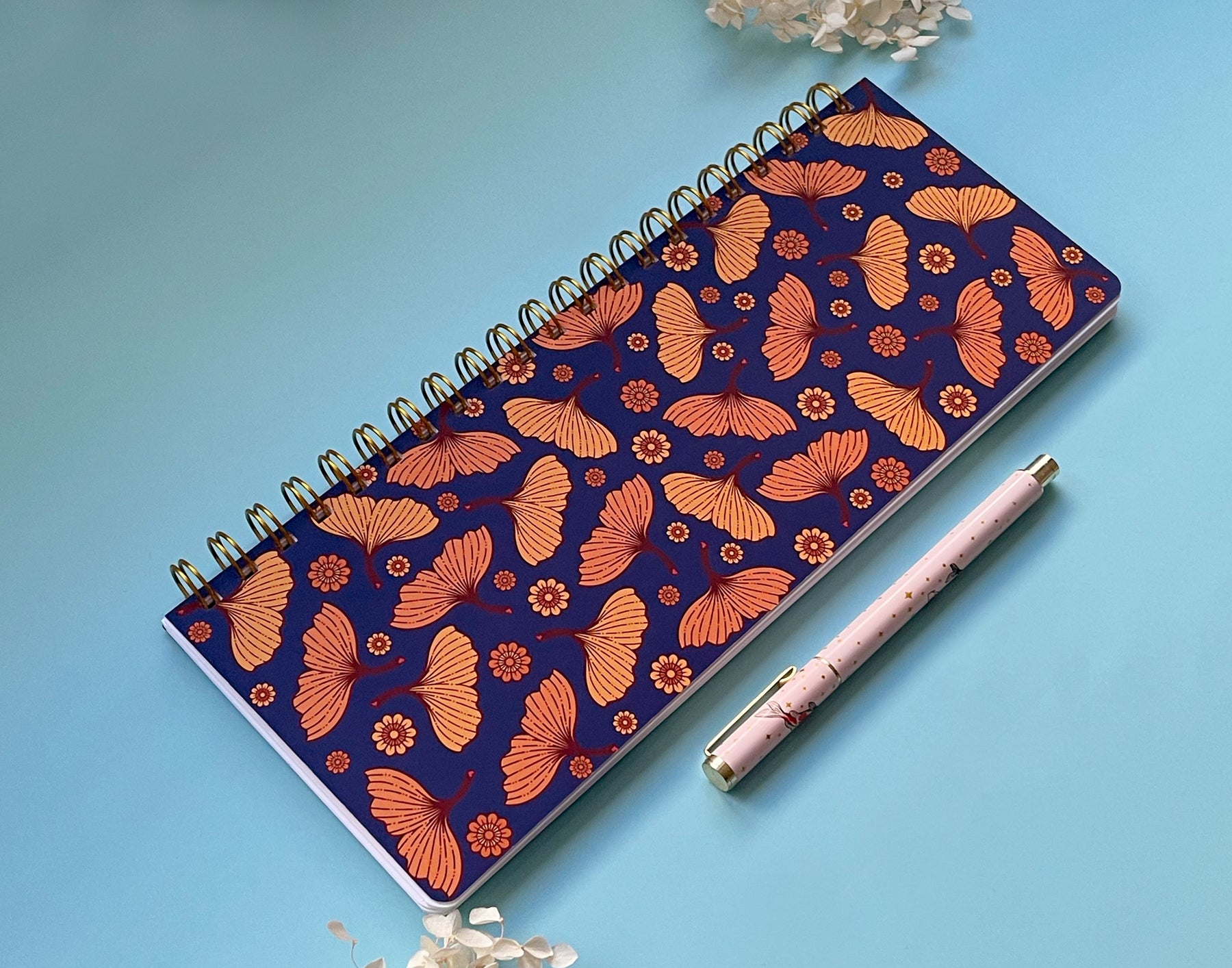 This beautiful coil bound Ginkgo Leaves and Flowers Weekly Planner features my original pattern artwork of gold and orange ginkgo leaves and flowers. Fully handmade and printed in small batches in studio, this planner features a matte art paper cover with 60 individual planning pages featuring a list and goals section on one side and a weekly layout on the other side. The planner can be opened fully flat thanks to the ring binding so you can plan your week and your goals on the same spread. This planner is ring bound with a gold-colored coil, has rounded corners on the bottom and is approximately 4"x11" in size with an art paper cover and stiff board backing for on the go planning.