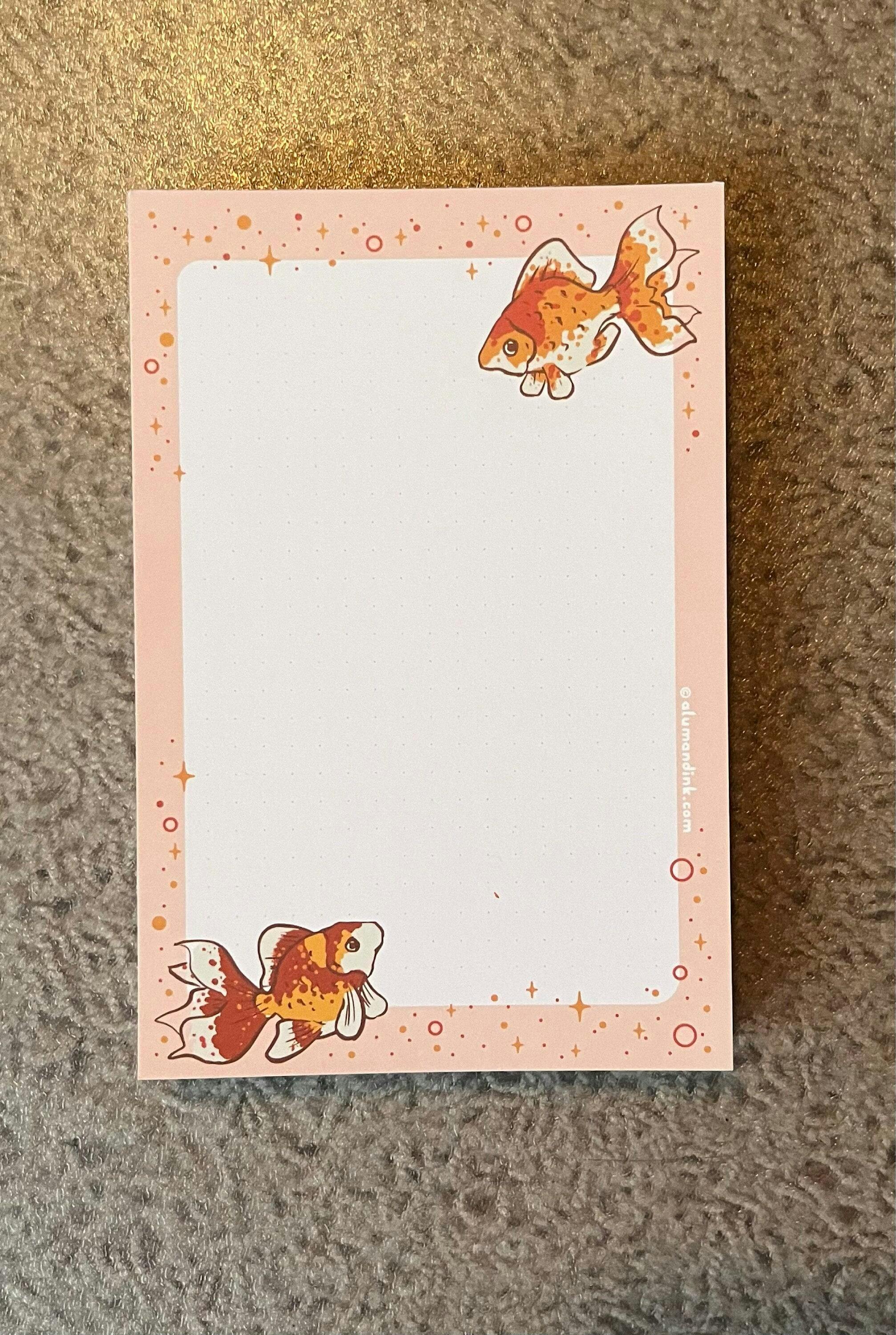 This lovely notepad can be used for your to do list, grocery list, memos and more. This notepad is printed on a premium 70lb paper and has 100 sheets with a large dotted grid area to help you line up your notes without getting in the way of readability. The notepad features my original artwork of two pretty goldfish and stars.