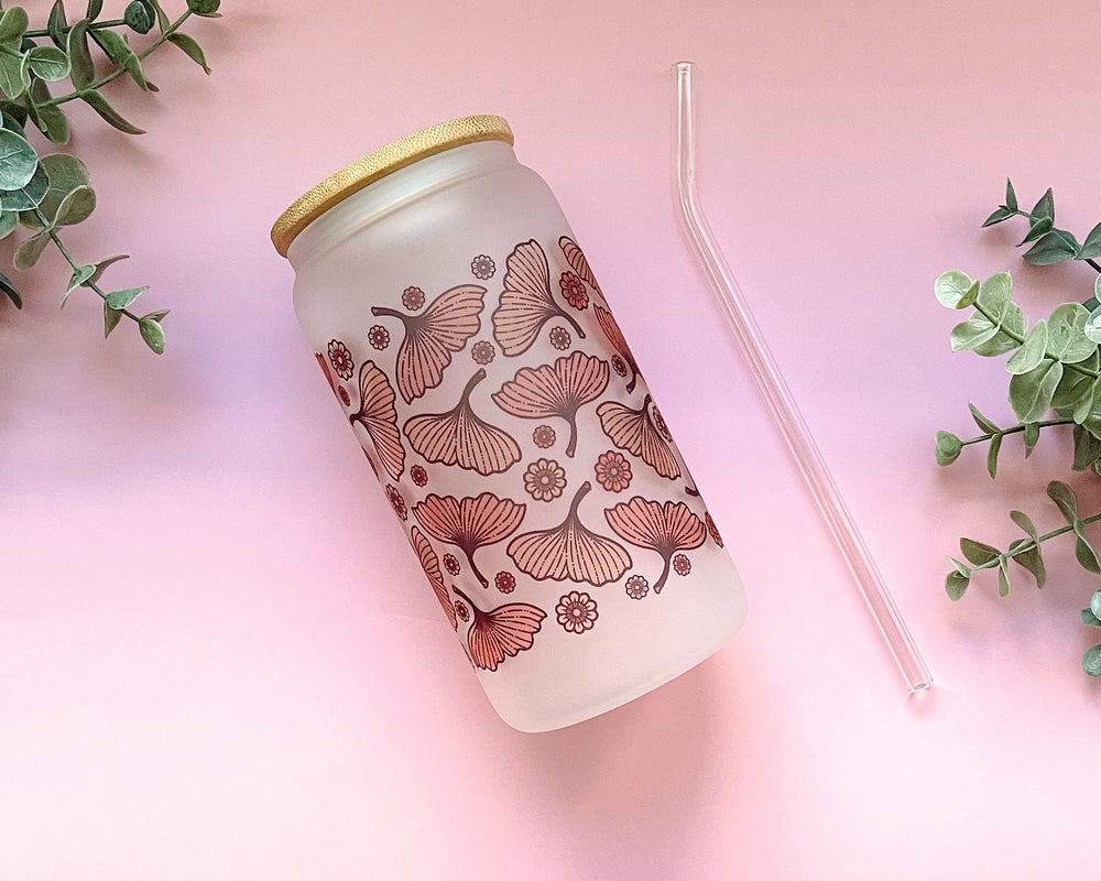This beautiful Autumn Ginkgo Leaves and Flowers Frosted Glass Tumbler is a convenient 16oz tumbler that features illustrations of yellow and yellow-orange autumn ginkgo leaves with small flowers in between. This tumbler is made from a sturdy borosilicate glass with a frosting on the exterior of the tumbler. These tumblers are handmade in studio using the sublimation method, so each tumbler may vary slightly. This tumbler measures 2.5" in diameter and 5.875" tall and it can hold up to 16oz of your favorite drink. Included with your glass tumbler is a bamboo cap with a silicone opening for a straw.