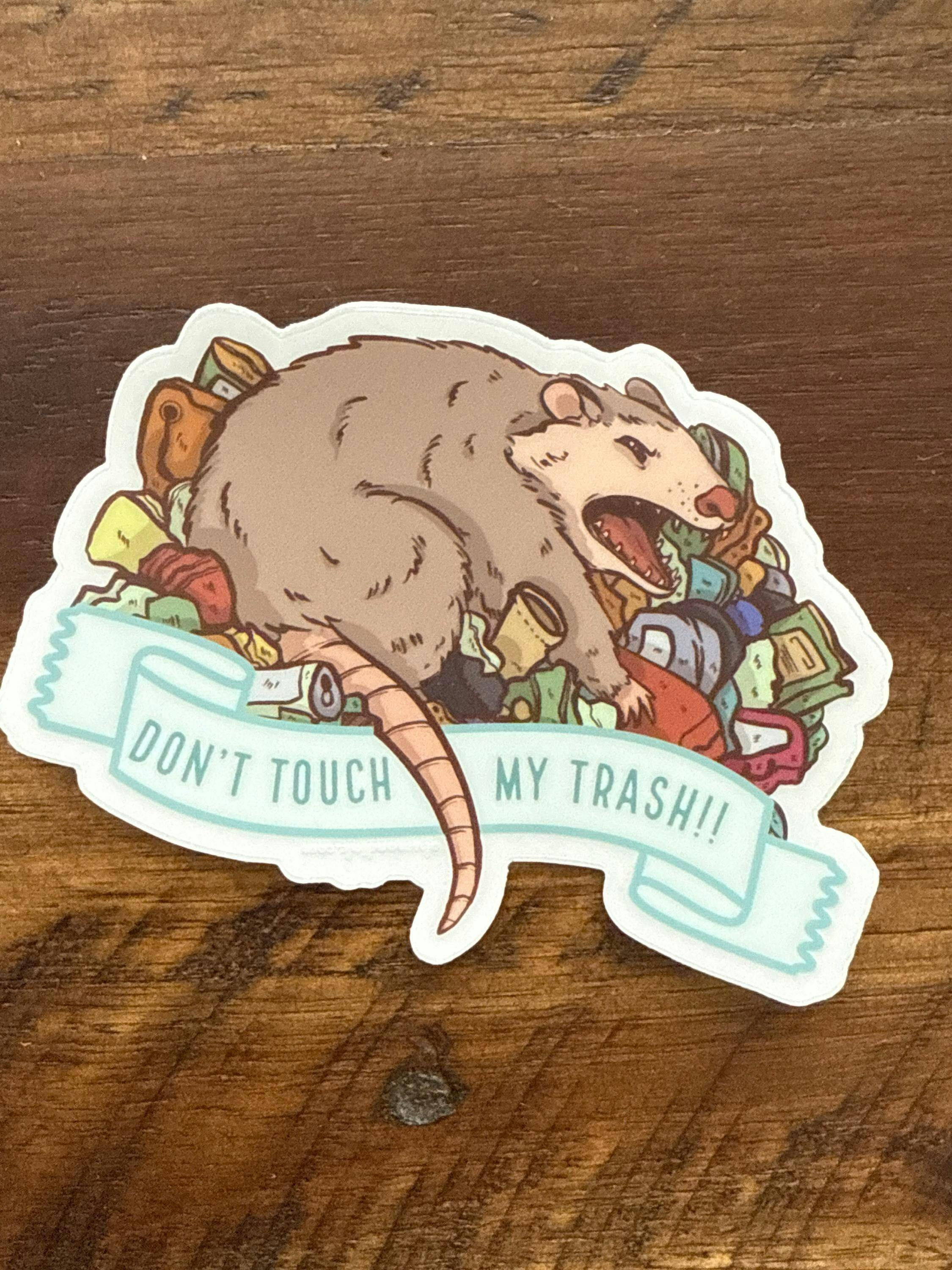 This funny Don't Touch my Trash Possum clear vinyl sticker features my original illustration of my possum character being very defensive about his pile of trash. This sticker is 3.75" at its longest side and is soft-coated to make it scratch and weather resistant. This is a clear vinyl sticker that adheres best to clean, smooth surfaces.
